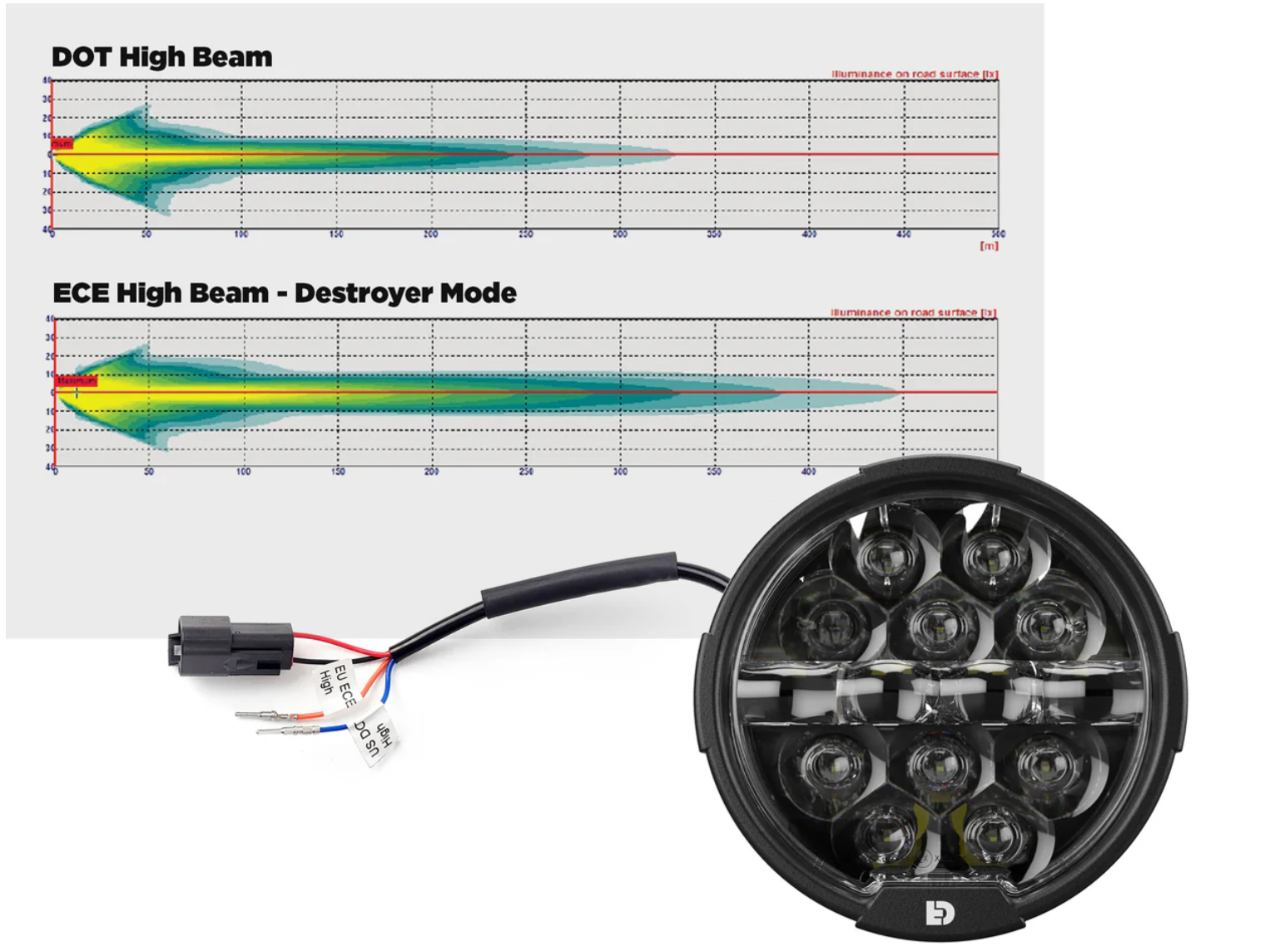 - Λειτουργία Υψηλής Δέσμης Destroyer: Αυτή η λειτουργία διπλασιάζει την απόδοση της υψηλής δέσμης DOT, παρέχοντας μια έντονη δέσμη οδήγησης πάνω από 200 πόδια πλάτος και 1500 πόδια μήκος με 12.900 ακατέργαστα λούμεν. Συμμορφώνεται με τις υψηλότερες τιμές καντέλα που επιτρέπονται από τους κανονισμούς European ECE και έχει σχεδιαστεί για μέγιστη απόδοση.