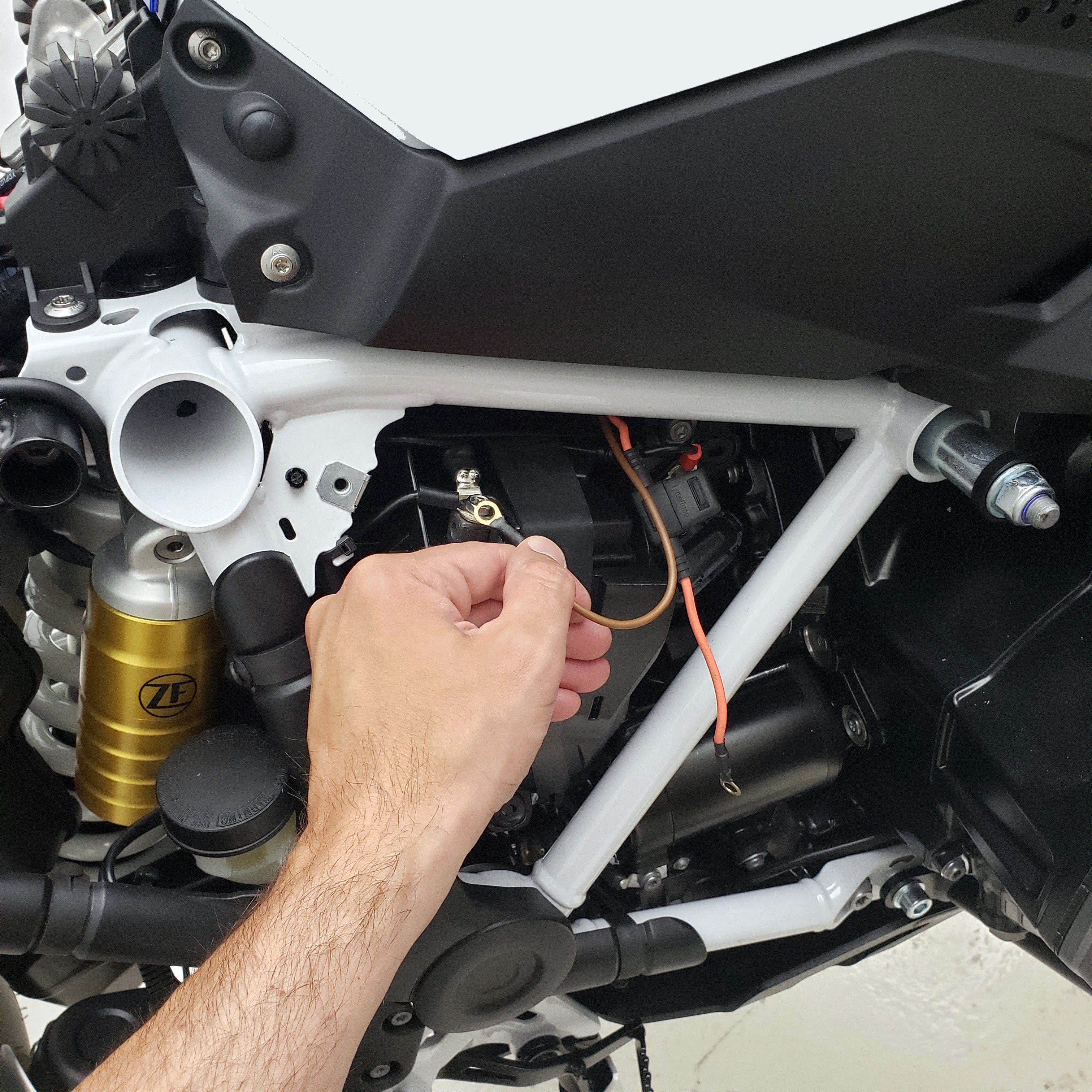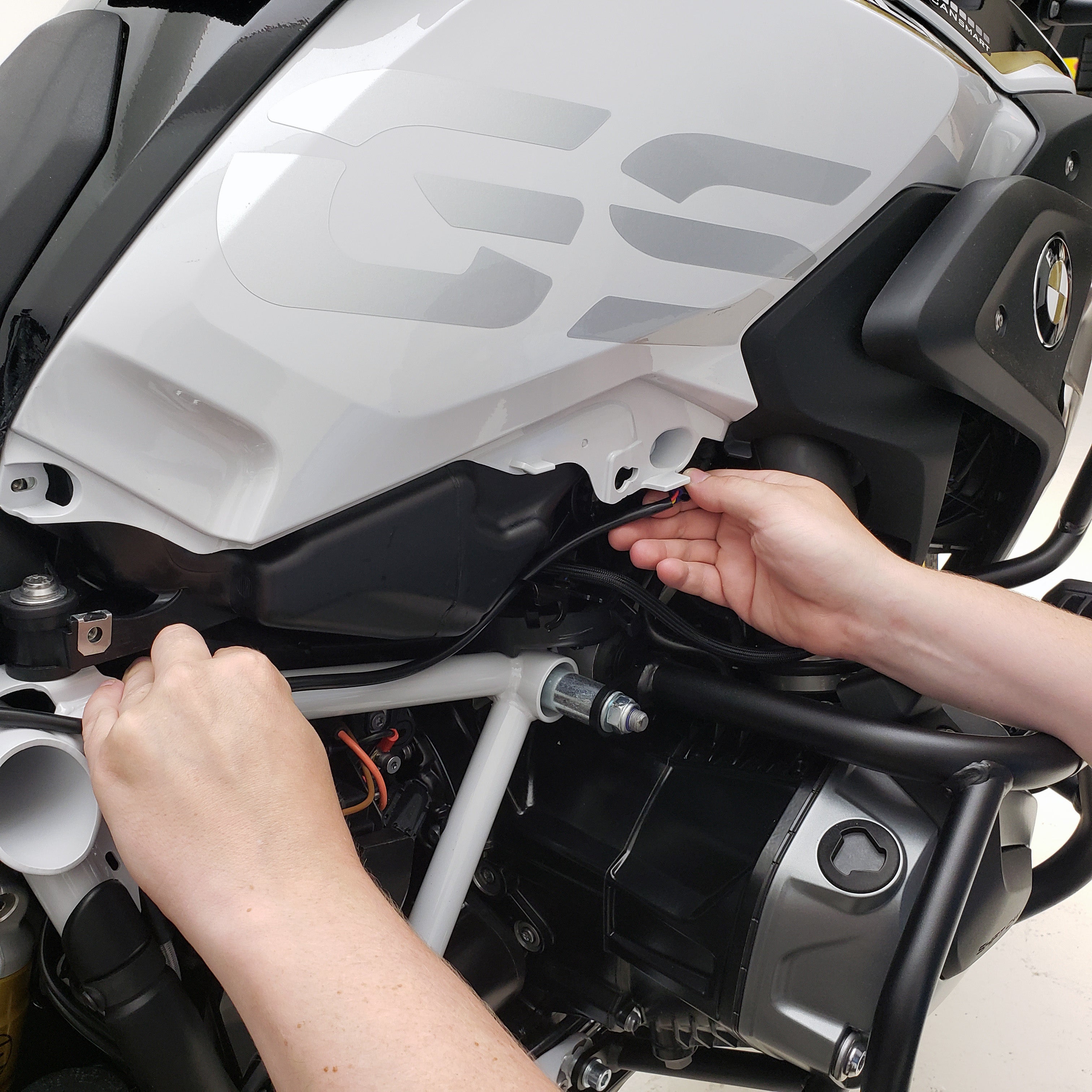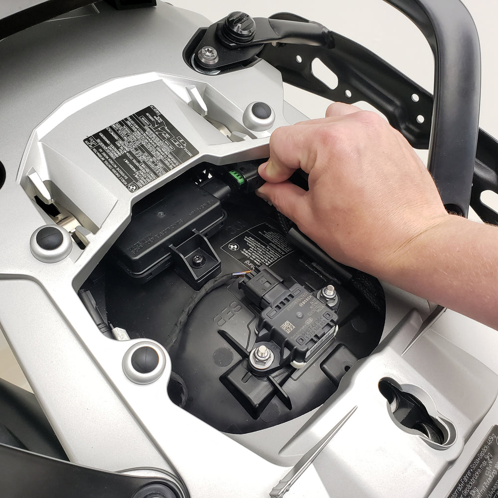 Plug the CANsmart unit into your bikes CANbus electrical system via a connector located under your seat. For R1200LC and R1250 models you connect to the Tire Pressure Monitor System (RDC). For all other BMW models you connect to the alarm system (DWA). Scroll down to see exactly which plug to connect to on your bike.