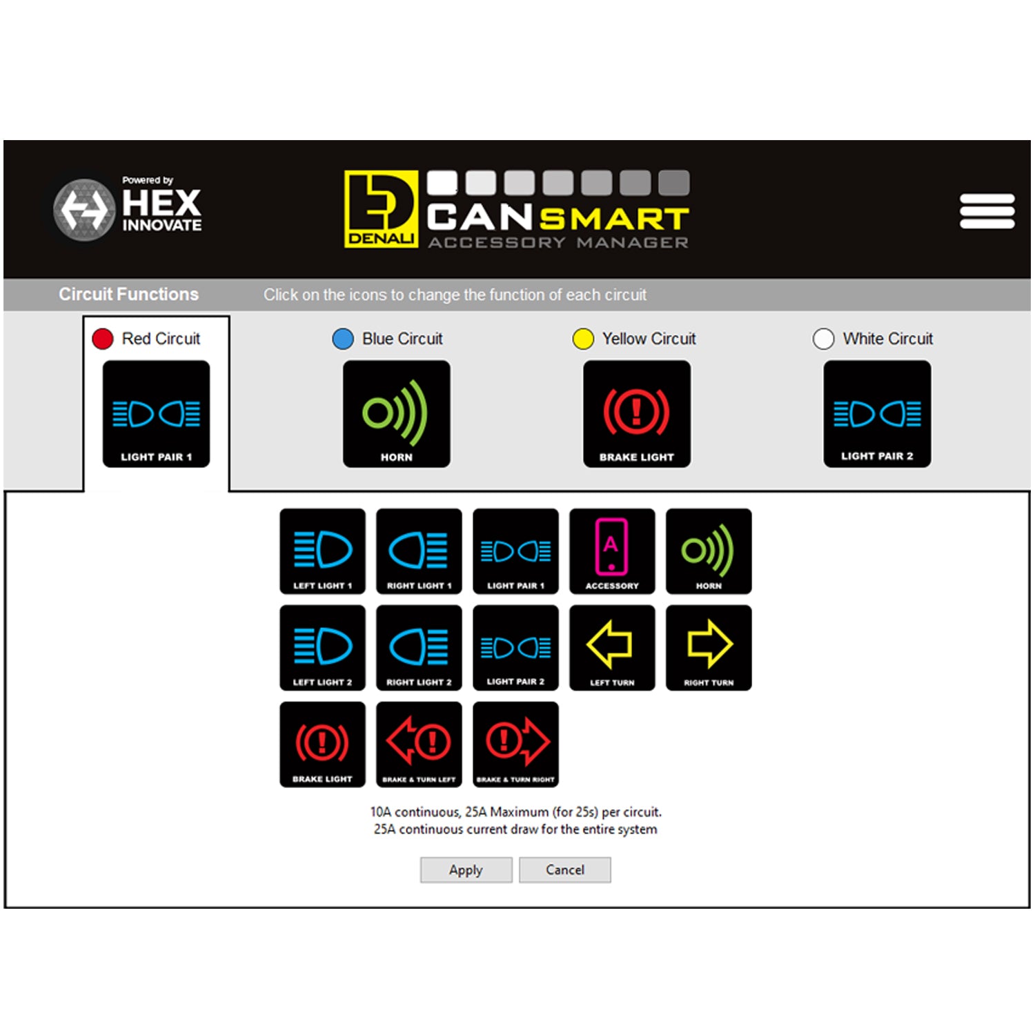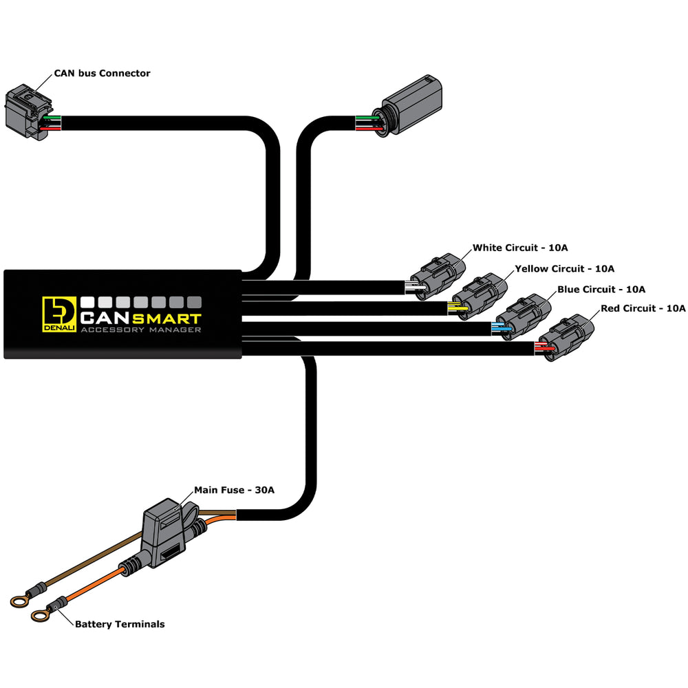 If you are installing DENALI Lights, a SOUNDBOMB horn or DENALI Brake Lights simply connect to the corresponding CANsmart circuit and there will be no programming necessary. All accessory features will be active and you are ready to ride!
