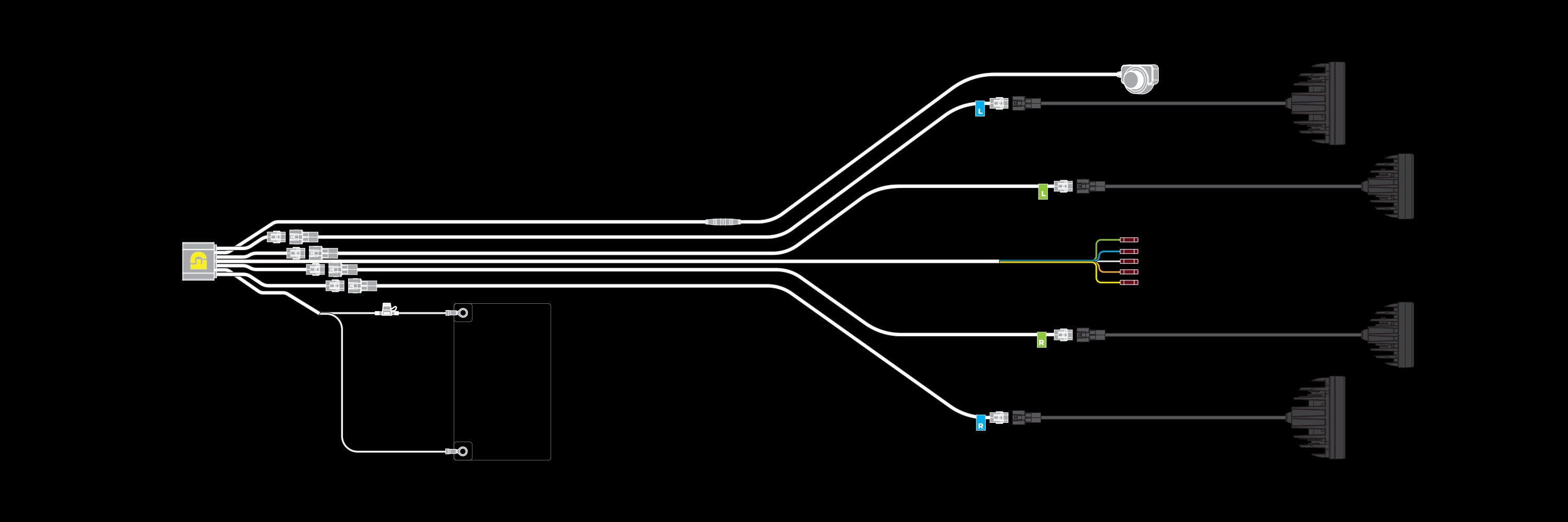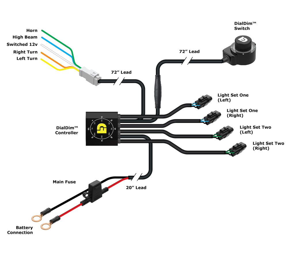 Oprócz wiązki przewodów kontrolera i przełącznika, zestaw zawiera (4x) pięciostopowe przedłużki lamp typu plug-and-play oraz uchwyt przełącznika na kierownicę. Po prostu dodaj kapsuły świetlne i jesteś gotowy do jazdy!