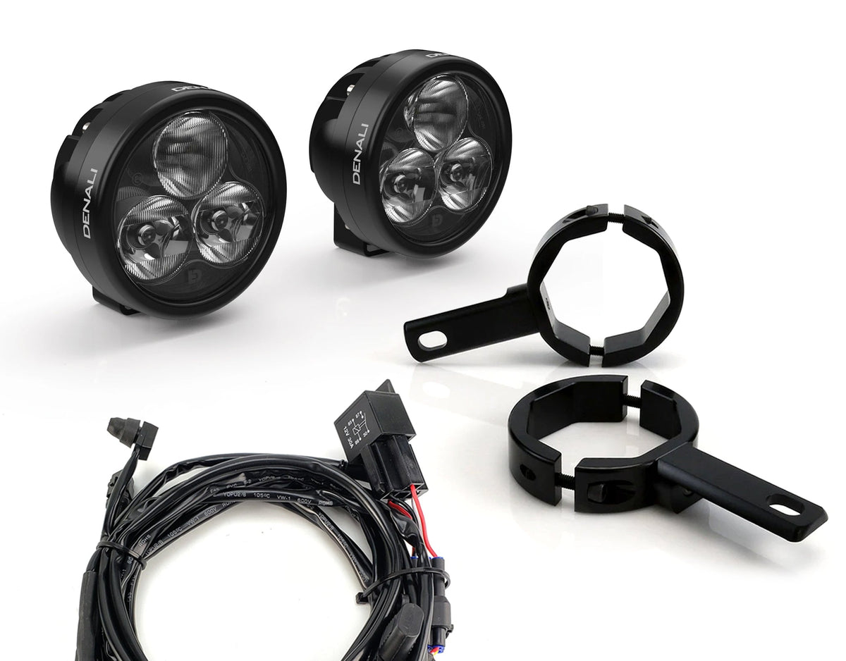 This product bundle includes our fork tube light mounts, standard Powersports wiring harness, and your choice of high-performance DENALI LED driving lights. Our machined aluminum fork clamps position auxiliary lights in the ideal location on your Ducati Scrambler. Our lights can be mounted directly to the clamp or on the included rotatable mounting shelf.