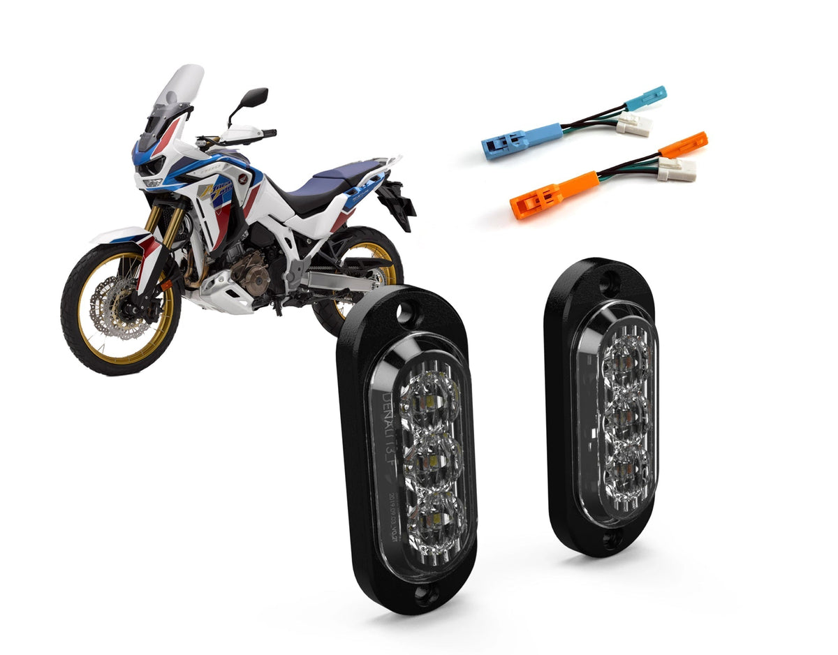 This pre-configured product bundle includes one set of DENALI Front T3 Modular Turn Signal Pods and a set of plug-&-play turn signal wiring adapters for the Honda Africa Twin 1100. Simply mount the T3 pods to your handguards or front fender and plug them in line at your factory front turn signal connector.