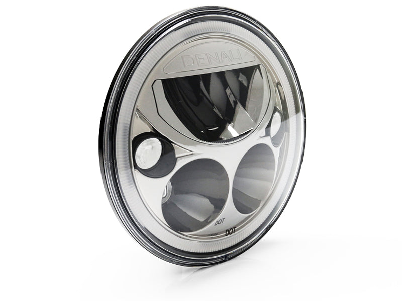 O módulo de farol LED M7 aprovado pela DENALI DOT é uma substituição direta plug and play para o farol selado original de 7 polegadas da sua mota. Apresenta um feixe baixo super amplo, feixe alto penetrante e luz diurna halo. Coloque este módulo de farol dentro da caixa do farol existente para projetar um feixe de luz três vezes mais longe do que o seu farol halogéneo de origem e duas vezes mais longe do que um farol LED de origem. O design único e o acabamento em cromo preto das ópticas darão à sua mota um aspeto moderno e personalizado, aumentando também a sua visibilidade para o tráfego que se aproxima, mesmo durante o dia.